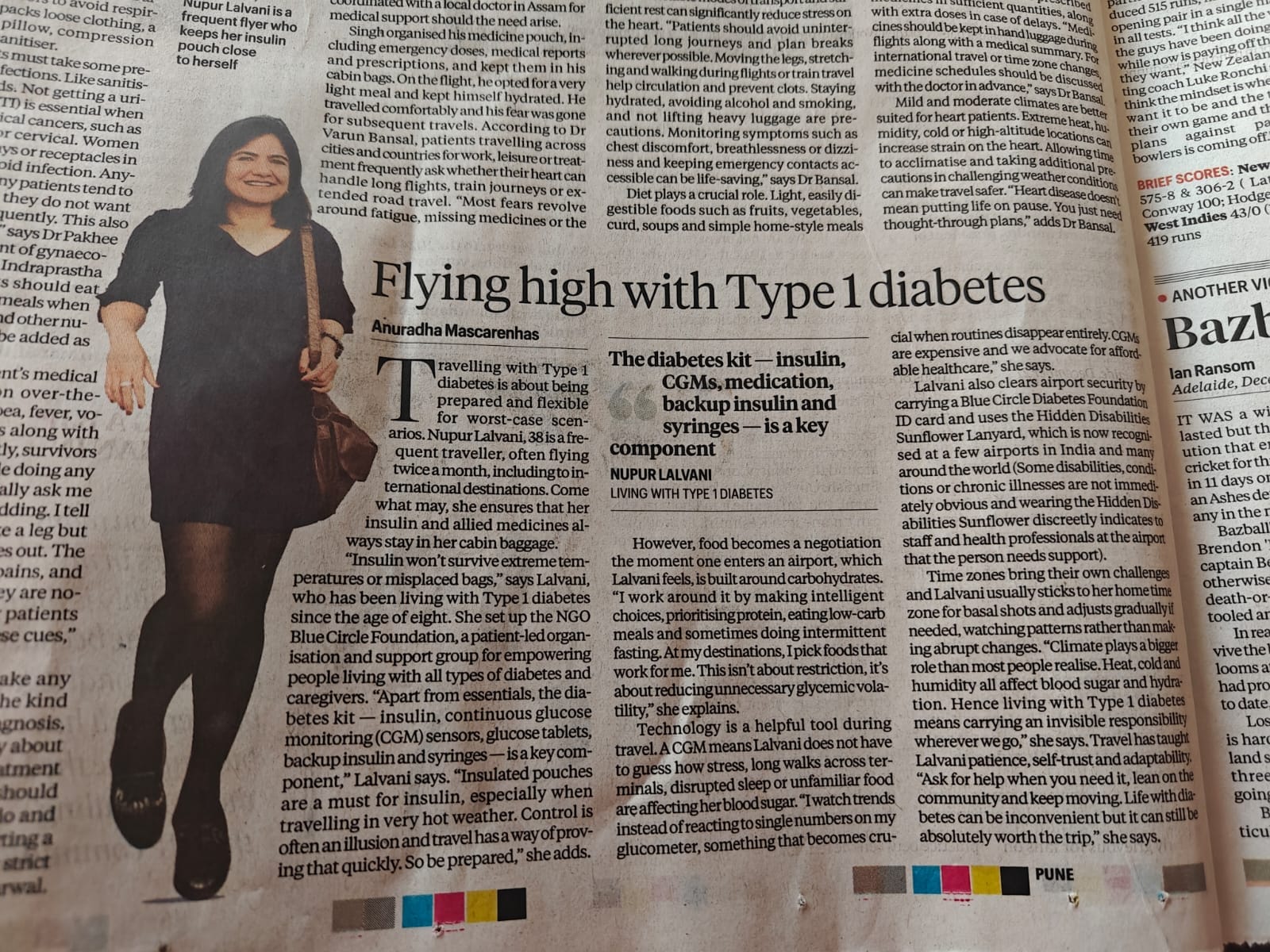 Flying high with type 1 diabetes - sharing practical insights on managing insulin, CGMs, airport security, time zones, food choices, and climate while travelling frequently, often across international borders. Featuring Nupur Lalvani in The Indian Express newspaper reported by Anuradha. Read here.