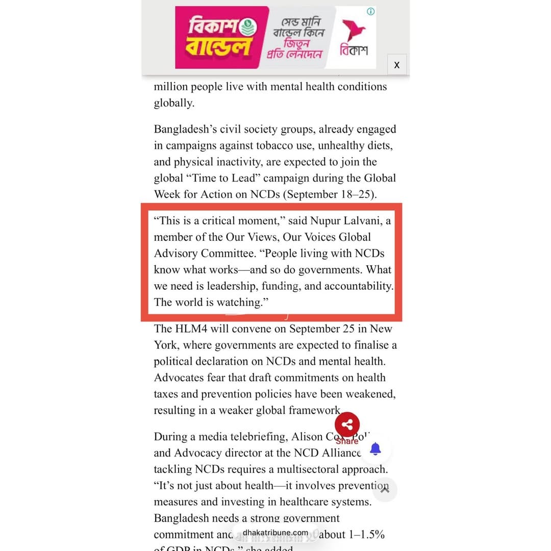 “Our voices matter” - Blue Circle Diabetes Foundation’s Nupur Lalvani featured in the Dhaka Tribune, calling for stronger leadership, funding & accountability for NCDs at the UN High-Level Meeting. Read it here.
